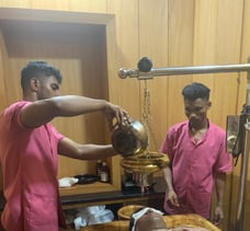 下剤療法は、呼んで字のごとく下剤を使用するのだが、いきなり下剤を服用するわけではなく、その準備のためにAbyanga(薬用オイルによる全身マッサージ)とSweda(薬用スチーム)を行う。これを5日間続けた後、6日目に下剤を服用する。